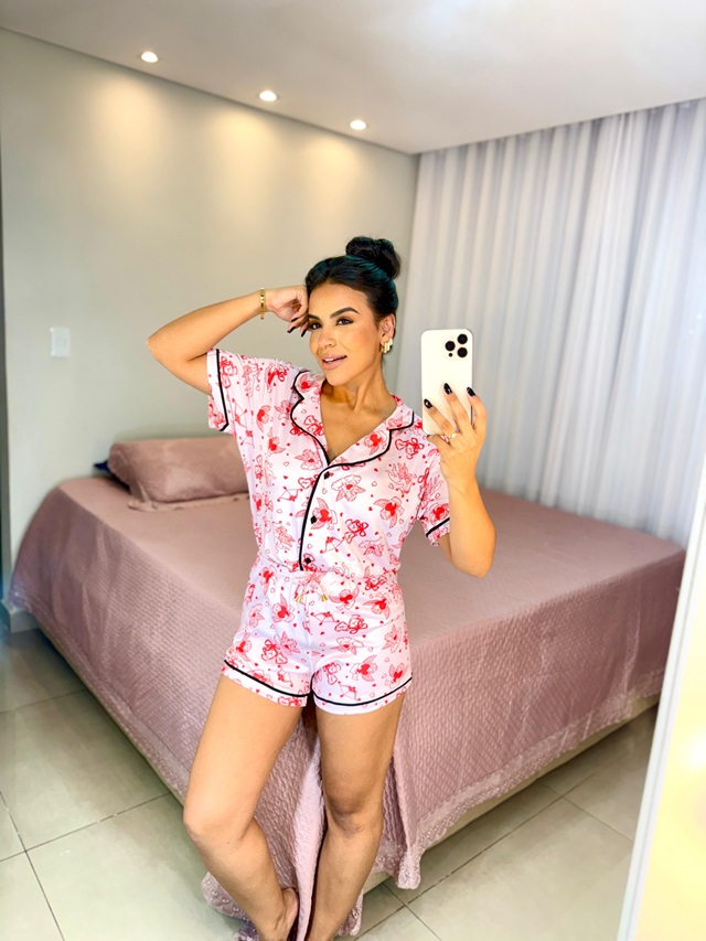 Pijama delicado e confortável, com estampa charmosa e modelagem que veste super bem. Confeccionado em tecido 67% poliéster e 33% viscose, une durabilidade, leveza e toque macio na pele. A blusa com botões e o short com amarração garantem praticidade e um caimento perfeito para suas noites de descanso.