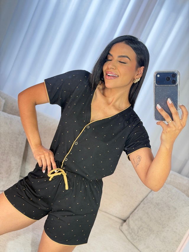 Pijama delicado e confortável, com estampa charmosa e modelagem que veste super bem. Confeccionado em tecido 67% poliéster e 33% viscose, une durabilidade, leveza e toque macio na pele. A blusa com botões e o short com amarração garantem praticidade e um caimento perfeito para suas noites de descanso.