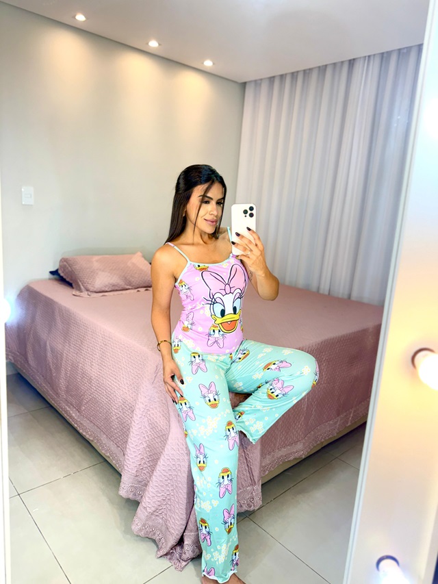 Pijama feminino em tecido leve, macio e com toque confortável, composto por blusa de alcinha e calça com modelagem soltinha. Possui estampa delicada que traz charme à peça e acabamento que garante melhor caimento, além de cós elástico para mais conforto e liberdade de movimento. Tamanho único veste do 36 ao 40